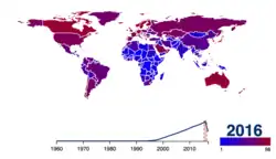 The International Telecommunication Union (ITU) estimated that, by the end of 2017, 48% of individual users regularly connect to the Internet, up from 34% in 2012.[79] Mobile Internet connectivity has played an important role in expanding access in recent years, especially in Asia and the Pacific and in Africa.[80] The number of unique mobile cellular subscriptions increased from 3.9 billion in 2012 to 4.8 billion in 2016, two-thirds of the world's population, with more than half of subscriptions located in Asia and the Pacific. The number of subscriptions was predicted to rise to 5.7 billion users in 2020.[81] As of 2018, 80% of the world's population were covered by a 4G network.[81] The limits that users face on accessing information via mobile applications coincide with a broader process of fragmentation of the Internet. Fragmentation restricts access to media content and tends to affect the poorest users the most.[80]