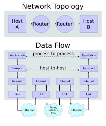The communications infrastructure of the Internet consists of its hardware components and a system of software layers that control various aspects of the architecture. As with any computer network, the Internet physically consists of routers, media (such as cabling and radio links), repeaters, modems etc. However, as an example of internetworking, many of the network nodes are not necessarily Internet equipment per se. The internet packets are carried by other full-fledged networking protocols with the Internet acting as a homogeneous networking standard, running across heterogeneous hardware, with the packets guided to their destinations by IP routers.