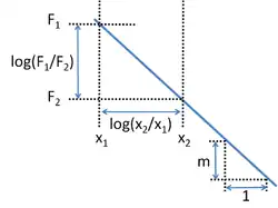 To find the slope of the plot, two points are selected on the x-axis, say x1 and x2. Using the below equation: and The slope m is found taking the difference: where F1 is shorthand for F(x1) and F2 is shorthand for F(x2). The figure at right illustrates the formula. Notice that the slope in the example of the figure is negative. The formula also provides a negative slope, as can be seen from the following property of the logarithm: