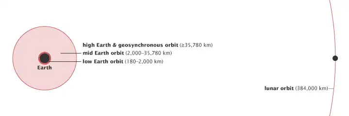 The MEO region includes the two zones of energetic charged particles above the equator known as the Van Allen radiation belts, which can damage satellites’ electronic systems without special shielding.[4]