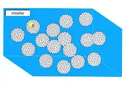 In colloid science, a micellar solution consists of a dispersion of micelles (small particles) in a solvent (most usually water). Micelles are made of chemicals that are attracted to both water and oily solvents, known as amphiphiles. In a micellar solution, some amphiphiles are clumped together and some are dispersed. Micellar solutions form when the concentration of amphiphile exceeds the critical micelle concentration (CMC) or critical aggregation concentration (CAC), which is when there are enough amphiphiles in the solution to clump together to form micelles. Micellar solutions persist until the amphiphile concentration becomes sufficiently high to form a lyotropic liquid crystal phase.[1][2][3][4]
