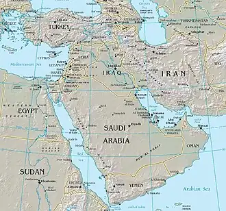 "Greater Middle East" is a political term coined by the second Bush administration in the first decade of the 21st century[33] to denote various countries, pertaining to the Muslim world, specifically Afghanistan, Iran, Pakistan, and Turkey.[34] Various Central Asian countries are sometimes also included.[35]