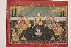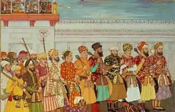 Group portrait of Mughal rulers, from Babur to Aurangzeb, with the Mughal ancestor Timur seated in the middle. On the left: Shah Jahan, Akbar and Babur, with Abu Sa'id of Samarkand and Timur's son, Miran Shah. On the right: Aurangzeb, Jahangir and Humayun, and two of Timur's other offspring Umar Shaykh and Muhammad Sultan. Created c. 1707–12