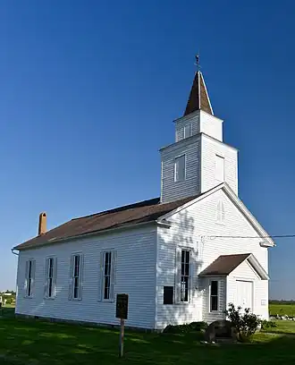 New Sweden Chapel is a historic Lutheran Church building located east of Fairfield, Iowa, United States in rural Jefferson County. The Swedish immigrant community that settled here was organized in 1845 under the leadership of Peter Cassel, a native of Kisa, Östergötland, Sweden. This was the first Swedish settlement in Iowa, as well as the first west of the Mississippi River.[2] They established a Lutheran congregation in 1848, and built a log church in 1851. This church replaced it in 1860. Local builder Henri Jagle was responsible for building the 50-by-30-foot (15.2 by 9.1 m) frame structure. It is four bays in length and features a 16-foot (4.9 m) tower with a spire over the main entrance. The interior features a painting by Olaf Grafström, who was an art instructor at Augustana College in Rock Island, Illinois. In 1948 the Augustana Evangelical Lutheran Church named the New Sweden Chapel as a National Synodial Shrine in recognition of its being the oldest congregation in the synod.[2] Prince Bertil of Sweden and the Archbishop of Uppsala participated in a ceremony that drew 3,000 people. The chapel no longer houses a regular congregation, but is used for special occasions. A cemetery is located on the church grounds. The chapel was listed on the National Register of Historic Places in 1977.[1]