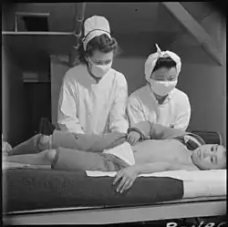 Many nurses saw active duty in the First World War, but the profession transformed again during the Second World War. British nurses of the Army Nursing Service were part of every overseas campaign.[38] More nurses volunteered for service in the US Army and Navy than any other occupation.[39][40] The Nazis had their own Brown Nurses, numbering 40,000.[41] Two dozen German Red Cross nurses were awarded the Iron Cross for heroism under fire.[42]