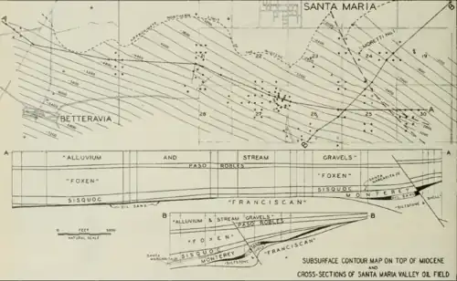 - ^ Canfield, Charles (1943). Santa Maria Valley Oil Field, in Geologic Formations and economic development of the Oil and Gas Fields of California. San Francisco: State of California Dept. of Natural Resources Division of Mines, Bulletin 118. p. 440.