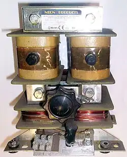 A variometer is a type of continuously variable air-core RF inductor with two windings.[24] One common form consisted of a coil wound on a short hollow cylindrical form, with a second smaller coil inside, mounted on a shaft so its magnetic axis can be rotated with respect to the outer coil. The two coils are connected in series. When the two coils are collinear, with their magnetic fields pointed in the same direction, the two magnetic fields add, and the inductance is maximum. If the inner coil is rotated so its axis is at an angle to the outer coil, the magnetic fields do not add and the inductance is less. If the inner coil is rotated so it is collinear with the outer coil but their magnetic fields point in opposite directions, the fields cancel each other out and the inductance is very small or zero. The advantage of the variometer is that inductance can be adjusted continuously, over a wide range. Variometers were widely used in 1920s radio receivers. One of their main uses today is as antenna matching coils to match longwave radio transmitters to their antennas.