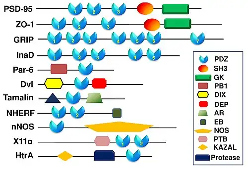 - ^ a b Harris BZ, Lim WA (September 2001). "Mechanism and role of PDZ domains in signaling complex assembly". Journal of Cell Science. 114 (Pt 18): 3219–31. doi:10.1242/jcs.114.18.3219. PMID 11591811.