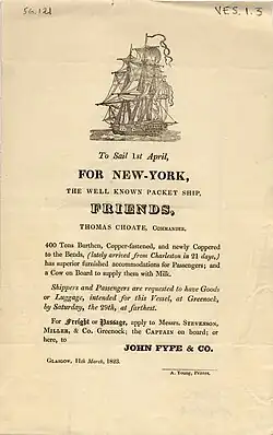 In 1818, ships of the Black Ball line began regularly scheduled trips between Britain and the United States. These "packet ships" (named for their delivery of mail "packets") were infamous for keeping to their disciplined schedules. This often involved harsh treatment of seamen and earned the ships the nickname "bloodboat".