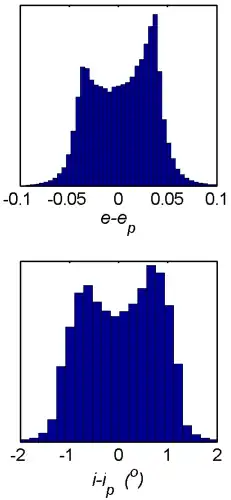 Distribution of the difference between proper and osculating orbital elements for asteroids with semi-major axes lying between 2 and 4 AU.