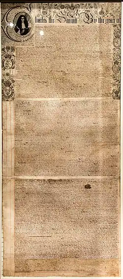 At a very great meeting and assembly of the freemen of the colony of Providence Plantation, at Newport, in Rhode Island, in New England, November the 24th, 1663. The abovesayed Assembly being legally called and orderly mett for the sollome reception of his Majestyes gratious letter pattent unto them sent, and having in order thereto chosen the President, Benedict Arnold, Moderator of the Assembly, it was Voted: That the box in which the King's gratious letters were enclosed be opened, and the letters with the broad seale thereto affixed be taken forth and read by Captayne George Baxter in the audience and view of all the people; which was accordingly done, and the sayd letters with his Majesty's Royall Stampe, and the broad seal, with much becoming gravity held up on hygh, and presented to the perfect view of the people, and then returned into the box and locked up by the Governor, in order to the safe keeping of it.[13]