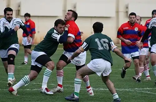 Tackling is a key component of rugby league play. Only the player holding the ball may be tackled. A tackle is complete, for example, when the player is held by one or more opposing players in such a manner that they can make no further progress and cannot part with the ball, or when the player is held by one or more opposing players and the ball or the hand or arm holding the ball comes into contact with the ground.[24] An attacking team gets a maximum of six tackles to progress up the field before possession is changed over. Once the tackle is completed, the ball-carrier must be allowed to get to their feet to 'play-the-ball'. Ball control is also important in rugby league, as a fumble of the ball on the ground forces a handover, unless the ball is fumbled backwards. The ball can also be turned over by going over the sideline.