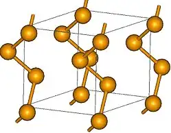 The most stable and dense form of selenium is gray and has a chiral hexagonal crystal lattice (space group 152 or 154 depending on the chirality)[19] consisting of helical polymeric chains, where the Se–Se distance is 237.3 pm and Se–Se–Se angle is 103.1°. The minimum distance between chains is 343.6 pm. Gray selenium is formed by mild heating of other allotropes, by slow cooling of molten selenium, or by condensing selenium vapor just below the melting point. Whereas other selenium forms are insulators, gray selenium is a semiconductor showing appreciable photoconductivity. Unlike the other allotropes, it is insoluble in CS2.[15] It resists oxidation by air and is not attacked by nonoxidizing acids. With strong reducing agents, it forms polyselenides. Selenium does not exhibit the changes in viscosity that sulfur undergoes when gradually heated.[14][20]