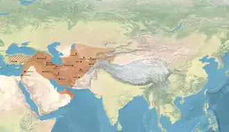 The founder of the dynasty was Seljuk, a warlord, who belonged to the Qiniq tribe of Oghuz Turks.[22] He led his clan to the banks of the Syr Darya river, near city of Jend, where they converted to Islam in 985.[23] Khwarezm, administered by the Ma'munids, was under the nominal control of the Samanid Empire.[24] By 999, the Samanids had fallen to the Kara-Khanid Khanate in Transoxiana, while the Ghaznavids occupied the lands south of the Amu Darya.[25] The Seljuks supported the last Samanid emir against the Kara-Khanids before establishing an independent base.[26]