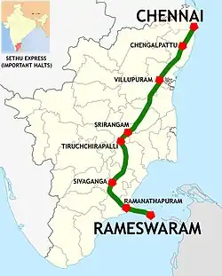 The 22661 / 22662 Sethu Superfast Express is a Superfast train of the Southern Railway zone of the Indian Railways and runs between Chennai Egmore and Rameswaram via Chord line and Tiruchirapalli - Karaikudi - Manamadurai Branch line. It is a standard train consisting of 23 coaches. The train covers a distance of 603 km (375 mi) with an average speed of 69 km/h (43 mph).
