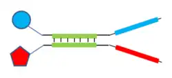 The yoctoreactor method introduced by Hansen et al.[21] is based on the geometry and stability of a three-dimensional DNA structure that creates a yoctoliter (10−24 L) size chemical reactor in which proximity of BBs brings about reactions among them. The DNA oligomers comprise the DNA-barcode for the attached BBs and form the structural elements of the reactor. One kind of yoctoreactor format is shown in the figure.