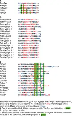 In 2001, biologically active hydroxyproline-rich glycopeptides were isolated from tobacco which activated the production of protease inhibitors in a similar way to systemin in tomatoes.[1] Although they are structurally unrelated to systemins, their similar function resulted in them being named hydroxyproline-rich systemins (HypSys). Following the initial discovery other HypSys peptides were found in tomato, Petunia and black nightshade.[2][4][5] In 2007, HypSys were found outside the Solanaceae, in sweet potato (Ipomoea batatas)[6] and sequence analysis identified HypSys analogs in poplar (Populus trichocarpa) and coffee (Coffea canephora).[10] Systemins are highly conserved between species, whereas HypSys are more divergent but all contain a conserved proline or hydroxyproline-rich central domain.