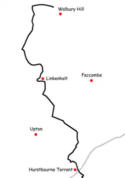 The northern end of the footpath starts in the car park on Walbury Hill. It passes through the towns of Romsey and Totton and the villages of Linkenholt, Ibthorpe, Hurstbourne Tarrant, St Mary Bourne, Longparish, Forton, Wherwell, Chilbolton, Stockbridge, Horsebridge and Mottisfont. The southern end of the footpath is at Eling Quay.