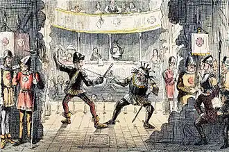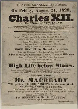 Theatre took a big pause during 1642 and 1660 in England because of the Puritan Interregnum.[71] The rising anti-theatrical sentiment among Puritans saw William Prynne write Histriomastix (1633), the most notorious attack on theatre prior to the ban.[71] Viewing theatre as sinful, the Puritans ordered the closure of London theatres in 1642.[72] On 24 January 1643, the actors protested against the ban by writing a pamphlet titled The Actors remonstrance or complaint for the silencing of their profession, and banishment from their severall play-houses.[73] This stagnant period ended once Charles II came back to the throne in 1660 in the Restoration. Theatre (among other arts) exploded, with influence from French culture, since Charles had been exiled in France in the years previous to his reign.