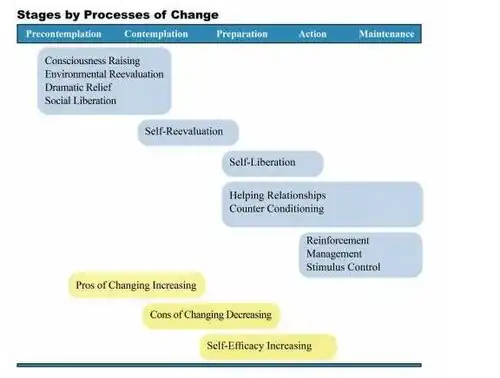 While most of these processes and strategies are associated with health interventions such as stress management, exercise, healthy eating, smoking cessation and other addictive behaviour,[23] some of them are also used in other types of interventions such as travel interventions.[24] Some processes are recommended in a specific stage, while others can be used in one or more stages.[1]