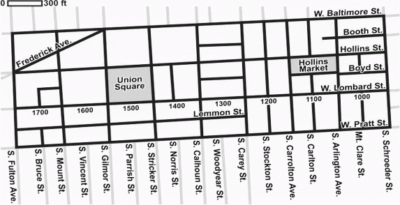 The District is bounded by South Fulton Street to the west and South Schroeder Street to the east, with north and south borders of West Baltimore and West Pratt Streets. Union Square proper, just west of the Market, is bounded by S. Stricker and S. Gilmore Streets from the east and west respectively, and by Hollins and W. Lombard Streets to the north and south. The area is built on a grid street system which conforms to the original 1818 layout of the area. Zip Code: 21223.