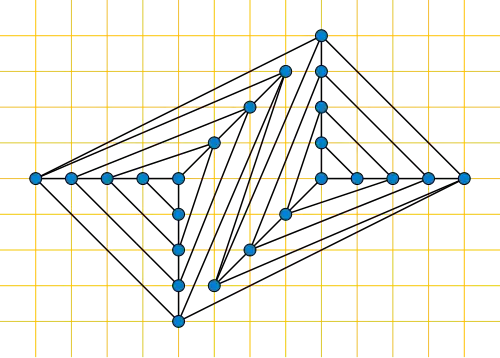 Several authors have shown that subsets of the integer lattice of size O(n) × O(n) are universal. In particular, de Fraysseix, Pach & Pollack (1988) showed that a grid of (2n − 3) × (n − 1) points is universal, and Schnyder (1990) reduced this to a triangular subset of an (n − 1) × (n − 1) grid, with n2/2 − O(n) points. By modifying the method of de Fraysseix et al., Brandenburg (2008) found an embedding of any planar graph into a triangular subset of the grid consisting of 4n2/9 points. A universal point set in the form of a rectangular grid must have size at least n/3 × n/3[2] but this does not rule out the possibility of smaller universal point sets of other types. The smallest known universal point sets are not based on grids, but are instead constructed from superpatterns (permutations that contain all permutation patterns of a given size); the universal point sets constructed in this way have size n2/4 − Θ(n).[3]