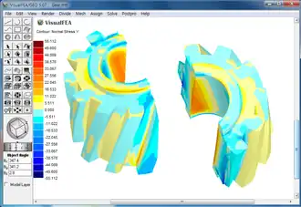 VisualFEA has various functions of visualizing the numerical data generated by solving the analysis models. The most frequently used graphical representation of the data are the contour and vector images. There are many other forms of graphical representation available in VisualFEA.[1]