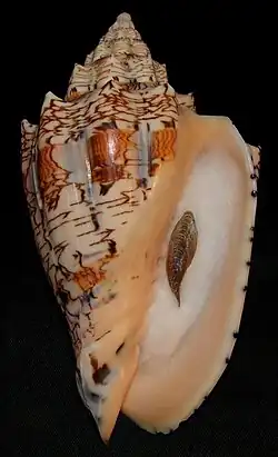 The outer lip is thick, and the aperture is relatively long and narrow. As is characteristic of volutes, the columella features a series of strong, oblique columellar folds (also known as plicae), typically numbering between nine and eleven.[8] These folds are especially prominent toward the anterior end of the shell. The operculum is corneous and claw-like in shape, partially covering the aperture.[11]