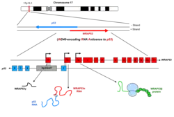 5. ^ a b c Mahmoudi S, Henriksson S, Corcoran M, Méndez-Vidal C, Wiman KG, Farnebo M (February 2009). "Wrap53, a natural p53 antisense transcript required for p53 induction upon DNA damage". Molecular Cell. 33 (4): 462–71. doi:10.1016/j.molcel.2009.01.028. PMID 19250907.