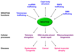WRAP53 (also known as WD40-encoding RNA antisense to p53) is a gene implicated in cancer development. The name was coined in 2009 to describe the dual role of this gene, encoding both an antisense RNA that regulates the p53 tumor suppressor and a protein involved in DNA repair, telomere elongation and maintenance of nuclear organelles Cajal bodies (Figure 1).[5][6][7][8]