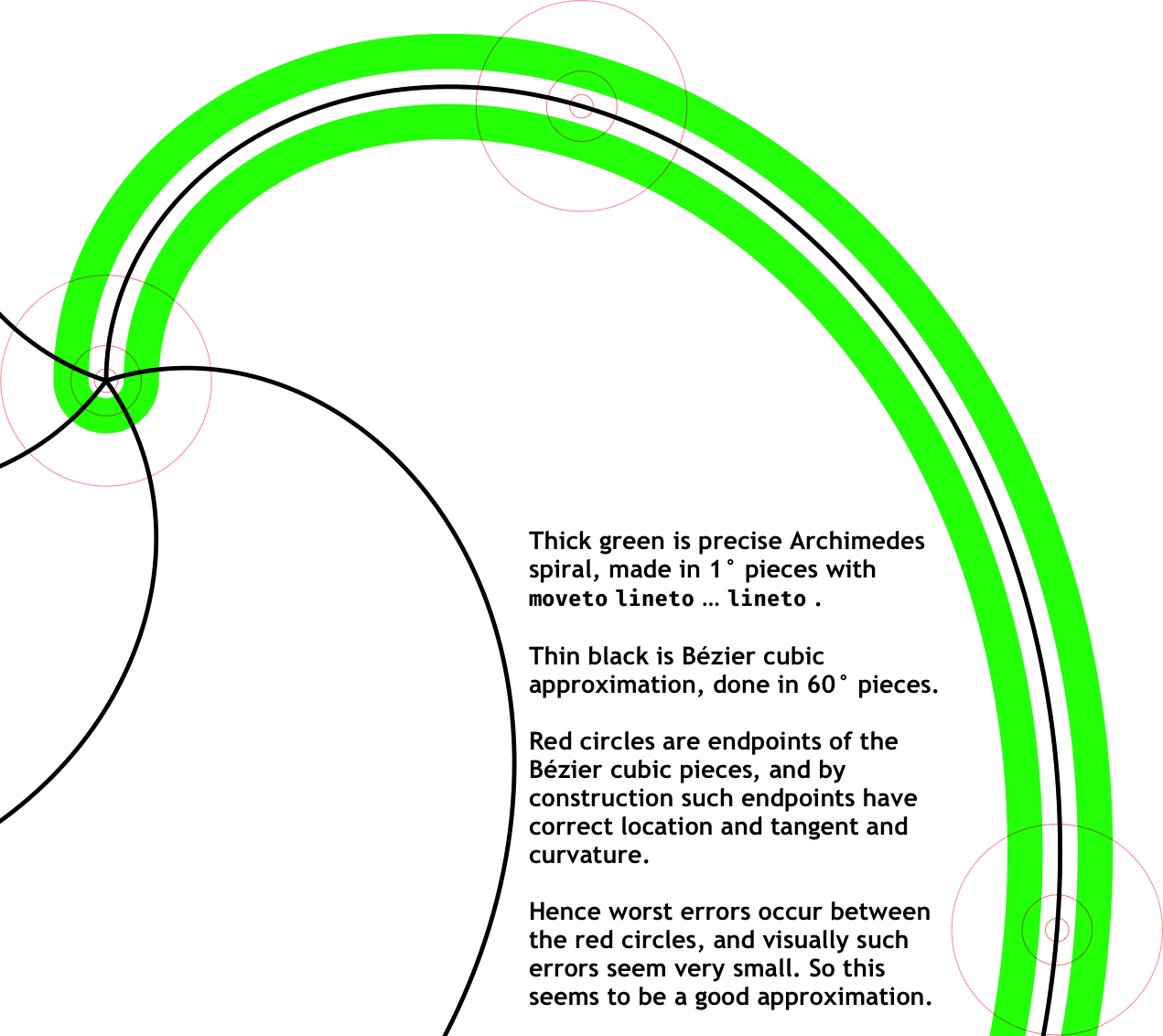 As part of an iOS app I’m making, I want to draw a decent approximation of an Archimedes spiral. The drawing library I’m using (CGPath in Quartz 2D, which is C-based) supports arcs as well as cubic and quadratic Bézier curves. What is a good method of approximating an Archimedes spiral using either of these path types? For example the wikipedia exemplar image says it was “drawn as a series of minimum-error Bézier segments.” How would one generate such segments?