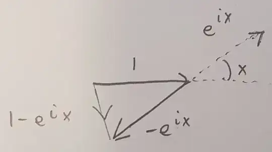 *A geometric derivation of this identity is shown above. The magnitude of $1-e^{-jx}$ can be calculates using the cosine rule as $\sqrt{1^2+1^2-2(1)(1)\cos x}$, which simplifies to $\sqrt{2-2\cos x}=2\sin\frac x2$; the argument is an easy application of angles in a triangle and is $\frac{x-\pi}2$.