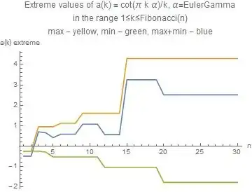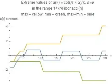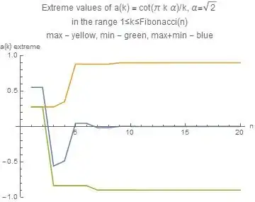 (iv) Extension: the same if $\phi$ is replaced by other irrational quantities like $\sqrt{2}$, $2^{\frac{1}{3}}$, $\log{2}$, $\gamma$, $\pi$, $e$. Here except for the case $\sqrt{2}$ I have no indication that the extremes exist at all, i.e. that $a(n)$ is bounded if $n \to \infty$.