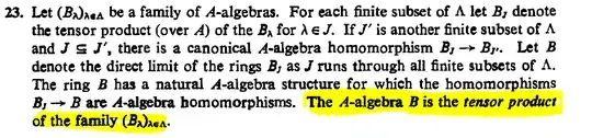 In this particular case, the canonical $A$-algebra homomorphism $B_J\to B_{J'}$ that Atiyah and Macdonal refer to is the one that extends a tensor by $1$s. E.g. if $B_J = B_1\otimes_A B_2$ and $B_{J'}$ is $B_1\otimes_A B_2\otimes_A B_3 \otimes_A B_4$, then the map $B_J\to B_{J'}$ is determined by $x_1\otimes x_2\mapsto x_1\otimes x_2\otimes 1\otimes 1$. So the elements of the direct limit are all elements of finite tensor products from the family, where we view two elements as equal if they are equal after we extend them both by $1s$ to put them in the same finite tensor product.