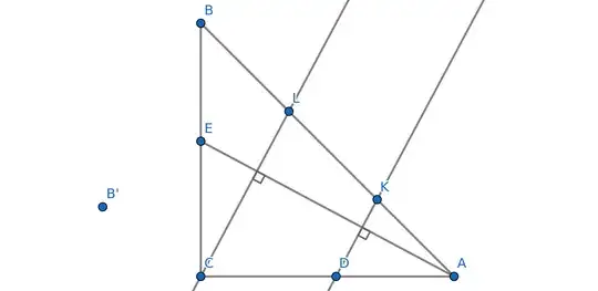 By moving $D$ I noted that $BB'||CL||DK$ (and indeed, they all are perpendicular to $AE$) and that reminded me of Thales' theorem -- if we have say $F=BB'\cap AC$