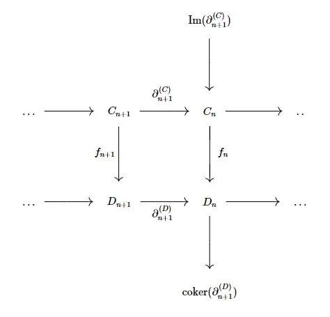 where $\overline{\partial_{n+1}^{(D)}}\text{Coim}(\partial_{n+1}^{(D)})$ is epic, as the composition of an epi with an iso. From this, we obtain finally : $$\text{coker}(\partial_{n+1}^{(D)})f_n\text{Im}(\partial_{n+1}^{(C)})=0,$$