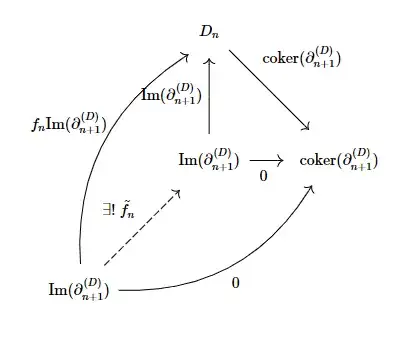 From this, we get : $$\text{coker}(\partial_{n+1}^{(D)})f_n\partial_{n+1}^{(C)}=\text{coker}(\partial_{n+1}^{(D)})\partial_{n+1}^{(D)}f_{n+1}=0.$$