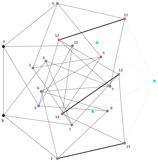We first need to find a parametrisation of the vertices of the graph with as few parameters as possible (that relate to metrics like lengths and angles); three parameters suffice. Fix $A$ and $B$ in the diagram below, set as parameters the angles $\alpha_1,\alpha_2,\alpha_3$ that the vectors $\vec{A0},\vec{B1},\vec{B2}$ make with $\vec{AB}$, then construct each of the remaining numbered points in order as the point that is a distance $1$ away from two already-determined points. (See the program at the end of this answer for the exact construction sequence.)