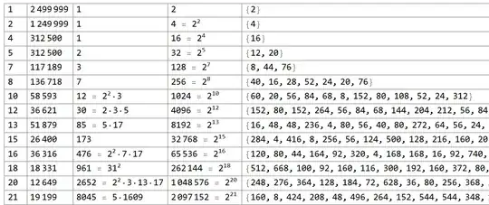 The leftmost column is $k$, the number of steps required to reach a smaller number. The fourth column, obviously going as $2^k$, is the period after which appearances of $k$ repeat. There are multiple appearances of a given $k$ within that period, e.g. for $k=5$ which shows up with alternating intervals of 12 and 20, but that's not required for my conjecture.