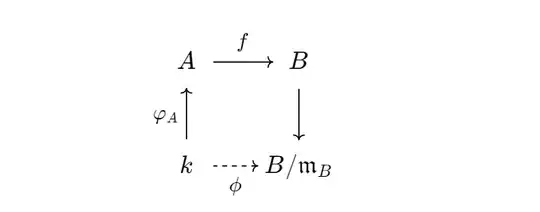 Let $k$ be a field. Then $(k,\text{id}_k)$ is a $k$-algebra. Let two further $k$-algebras $(A,\varphi_A)$ and $(B,\varphi_B)$, such that both are local as rings, and a $k$-algebra homomorphism $f:A\rightarrow B$, i.e. $\varphi_B=f\circ\varphi_A$, be given.