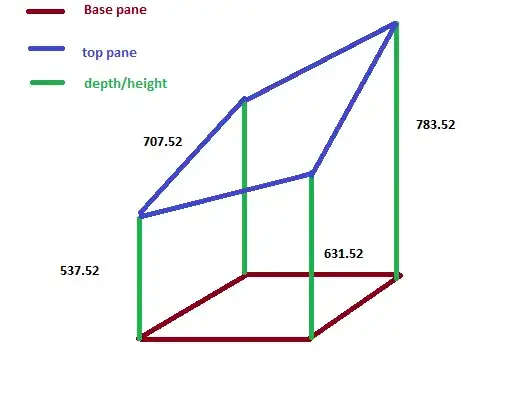 Now, $V_A+V_C$ is the volume of the figure where we assume the top is formed by two triangles that meet at a "crease" above diagonal $BD$; and $V_B+V_D$ is the volume when the crease appears above diagonal $AC$. (Note that one of the creases will be a "valley", and one a "ridge".) The desired volume is perhaps somewhere in between, so why not take an average?