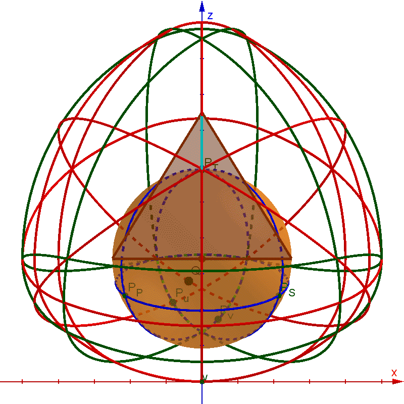 This GIF shows the outline of each surface patch in dark green curves, with red curves crossing the centers of each patch. All red and green curves are composed of circular arcs. The base tetrahedron is shown in brown. One vertex-sphere is shown in orange, with bright green circular arcs denoting the boundary of that vertex's surface patch and extended to full circles on the surface of the sphere with dark blue arcs. A cyan line passes through that vertex, the center of the vertex-sphere-patch, the centroid of the base tetrahedron, and the center of the face opposite the highlighted vertex.