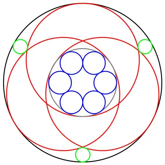 Moving to the diagram on the right. In its center we have a hexagonal arrangement of blue circles circumscribed by the gray circle, so we have