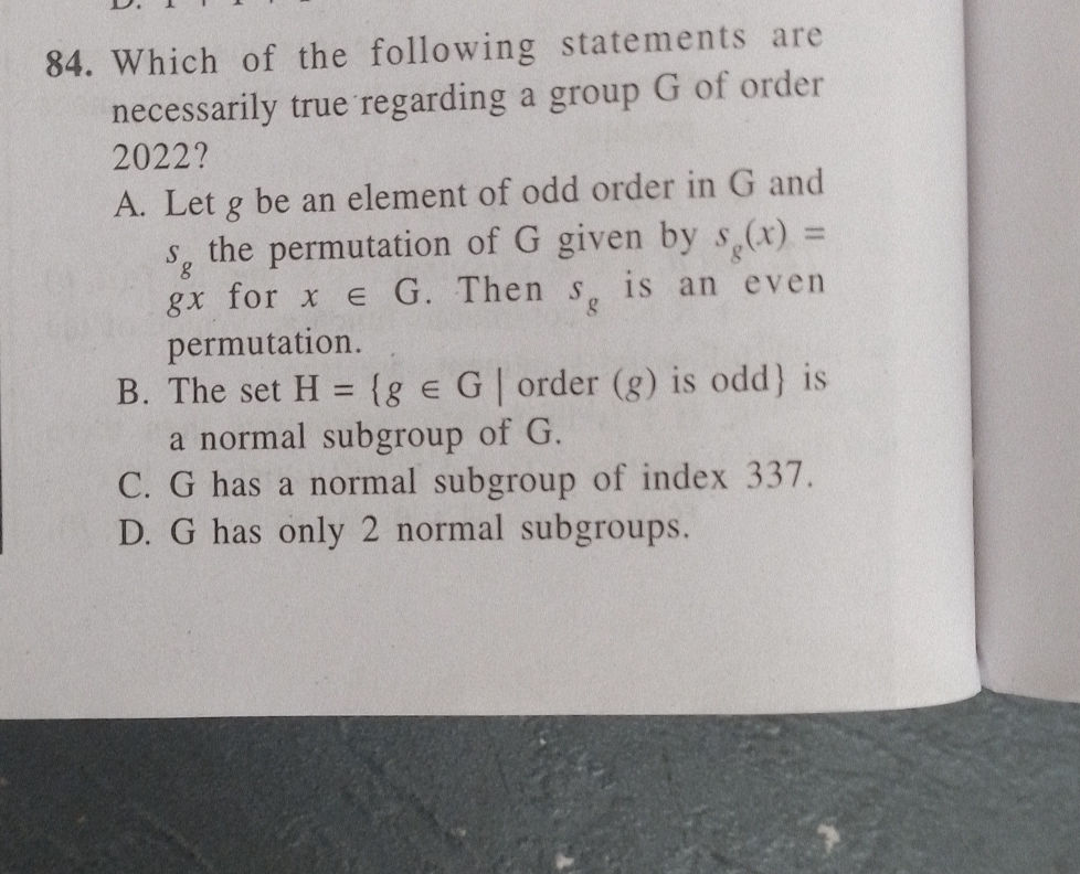 And for option (a),let $G$={$g_1$,$g_2$,....$g_{2022}$} and let $g=g_{10}$$(say)$.Then $s_{g_{10}}(x)$=$g_{10}x$ for all $x\in G$.Since o($g_{10}$)= odd $\implies$ ${g_{10}}^{2k+1}$=$e$,where $e$ is the identity.Then ${s_{g_{10}}(x)}^2$=$g_{10}g_{10}x$, continuing like this, ${s_{g_{10}}(x)}^{2k+1}$=$ex$=$x$. Thus $o(s_{g_{10}}(x))$= odd.So,it can be written as product of even number of transpositions.Therefore (a) is true.