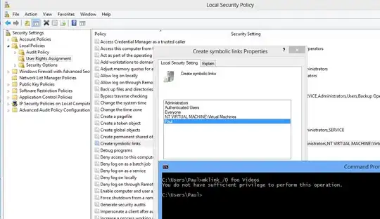 However, on Win8, even adding "Everyone" to the SeCreateSymbolicLinkPrivilege ("Create Symbolic Links" in secpol.msc) under local group policy still results in STATUS_PRIVILEGE_NOT_HELD. Why?