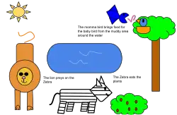 A simplified example of a community. A community includes many populations and how they interact with each other. This example shows interaction between the zebra and the bush, and between the lion and the zebra, as well as between the bird and the organisms by the water, like the worms.