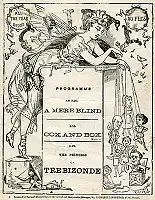 Burnand adapted the libretto for this "triumviretta" from John Maddison Morton's famous farce, Box and Cox, which had premiered in London in 1847, starring J. B. Buckstone.[5] The text follows Morton's play closely, differing in only two notable respects. First, in the play the protagonists lodge with Mrs Bouncer; in Burnand's version the character is Sergeant Bouncer.[n 1] This change was necessitated by the intention of performing the piece for the all-male gathering of the Moray Minstrels. Secondly, Burnand wrote original lyrics to be set to music by the 24-year-old Sullivan. The date and venue of the first performance was much disputed, starting in 1890, in duelling letters to The World, with Burnand and Lewis each claiming to have hosted it. Andrew Lamb has concluded that the run-through at Burnand's home on 23 May 1866, without costumes or sets, was a rehearsal before a small group of invited friends, followed by the first performance at Lewis's home on 26 May 1866.[8][n 2] A printed programme dated 23 May later surfaced, suggesting more than a mere rehearsal,[10] but the composer himself supported the later date, writing to The World: "I feel bound to say that Burnand's version came upon me with the freshness of a novel. My own recollection of the business is perfectly distinct".[11] John Foster, who played Bouncer in the production,[n 3] called the run-through at Burnand's house a rehearsal.[12] The original cast also included George du Maurier as Box and Harold Power as Cox, with Sullivan improvising the accompaniment at the piano.[8]