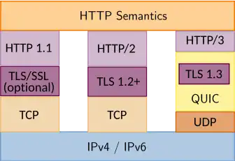 HTTP/3 is the third major version of the Hypertext Transfer Protocol used to exchange information on the World Wide Web, complementing the widely deployed HTTP/1.1 and HTTP/2. Unlike previous versions which relied on the well-established TCP (published in 1974),[2] HTTP/3 uses QUIC (officially introduced in 2021),[3] a multiplexed transport protocol built on UDP.[4]