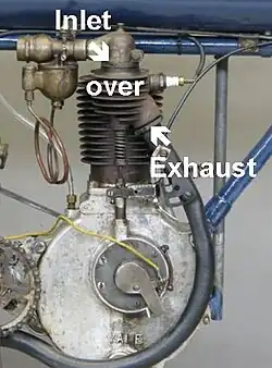 The IOE valvetrain layout was used extensively in early American motorcycles, mainly based on a French design by De Dion-Bouton.[11] Harley-Davidson used IOE engines with atmospheric inlet valves until 1912,[12] and with mechanically driven inlet valves from 1911 to 1929.[13] Indian used IOE valvetrains on all of their four-cylinder bikes except those built in 1936 and 1937.[14][15] Other American motorcycle manufacturers that used IOE engines included Excelsior, Henderson, and Ace.[16]