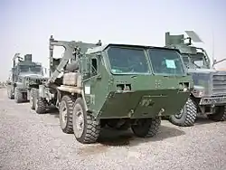 The LVS was fielded in 1985 as the Marine Corps heavy tactical vehicle system.[1] It was designed and manufactured by the Oshkosh Corporation. The United States Army does not use the LVS, it uses the Heavy Expanded Mobility Tactical Truck (HEMTT). The key differences between the two is the LVS's ability to interchange Front Power Units with Rear Body Units. The LVS also steers through both standard wheel pivoting (as on a typical automobile) and hydraulic yaw steering (by articulating the Front Power Unit against the Rear Body Unit). This enabled the LVS to meet the turning radius requirements of the U.S. Marines. LVS is rated to haul up to 22.5 tonnes (50,000 lb) on highways.[1]